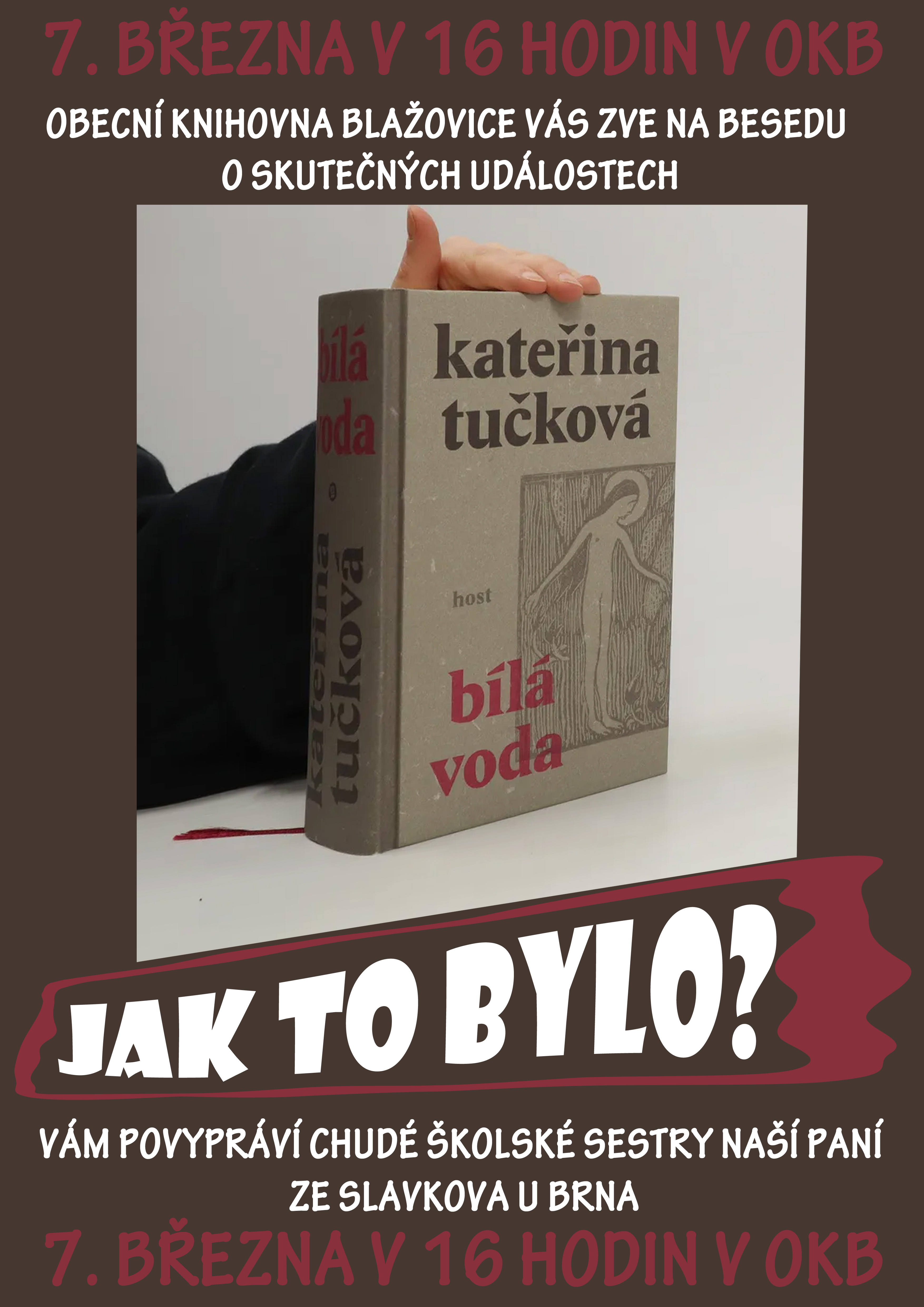 Obecní knihovna Blažovice Vás zve na besedu o knize Bílá voda od autorky Kateřiny Tučkové. Případní zájemci o besedu se mohou obrátit na paní Dagmar Vovesnou, knihovnici místní knihovny Prace, která po dohodě může zajistit rovněž dopravu na besedu.