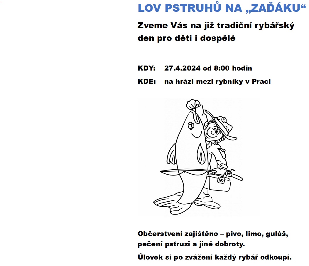 Tradiční rybářský den pro děti i dospělé. Občerstvení zajištěno - pivo, limo, guláš, pečení pstruzi a jiné dobroty. Úlovek si každý rybář odkoupí