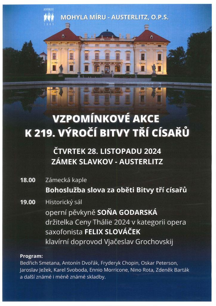 18:00 Bohoslužba slova za oběti Bitvy tří císařů 19:00 operní pěvkyně Soňa Godarská saxofonista Felix Slováček
